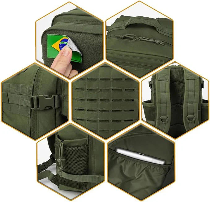 - Diseño distintivo MOLLE cortado con láser.